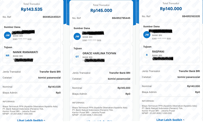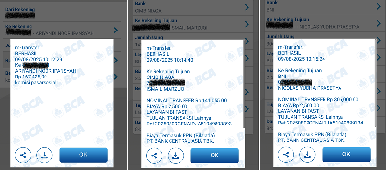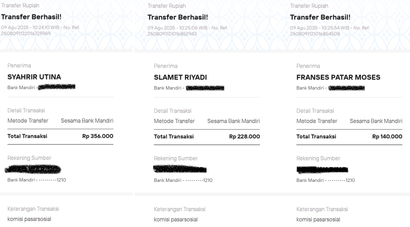Berikut ini adalah beberapa Bukti Pembayaran Pasarsosial pada bulan Agustus 2025 (Dibawah ini hanya beberapa saja). Cek rekening masing masing :